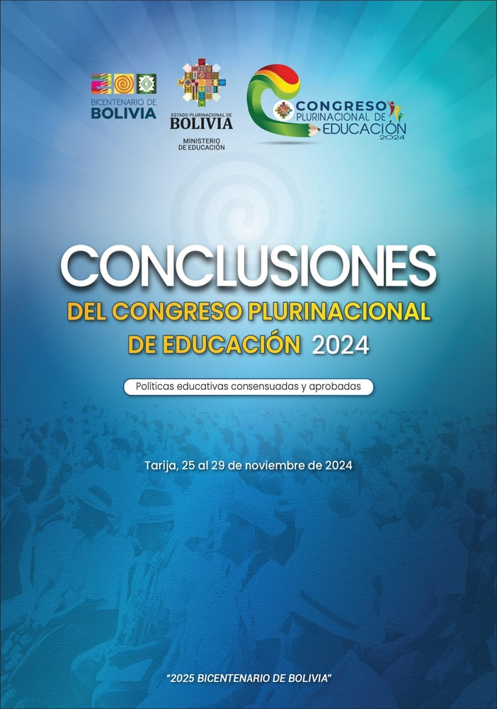 El Congreso Plurinacional de Educación, realizado en Tarija del 25 al 29 de noviembre de 2024, reunió a diversos sectores e instituciones educativas del país para analizar la realidad del sistema educativo boliviano y proponer políticas orientadas a mejorar su calidad y fortalecer el desarrollo del Estado Plurinacional. A partir del debate en 22 comisiones y múltiples espacios participativos previos, se abordaron temas como el diagnóstico educativo, currículo, formación docente, gestión participativa y financiamiento. El documento resultante sistematiza las propuestas, objetivos y líneas de acción acordadas, con el propósito de contribuir a la transformación y fortalecimiento de la educación en Bolivia.